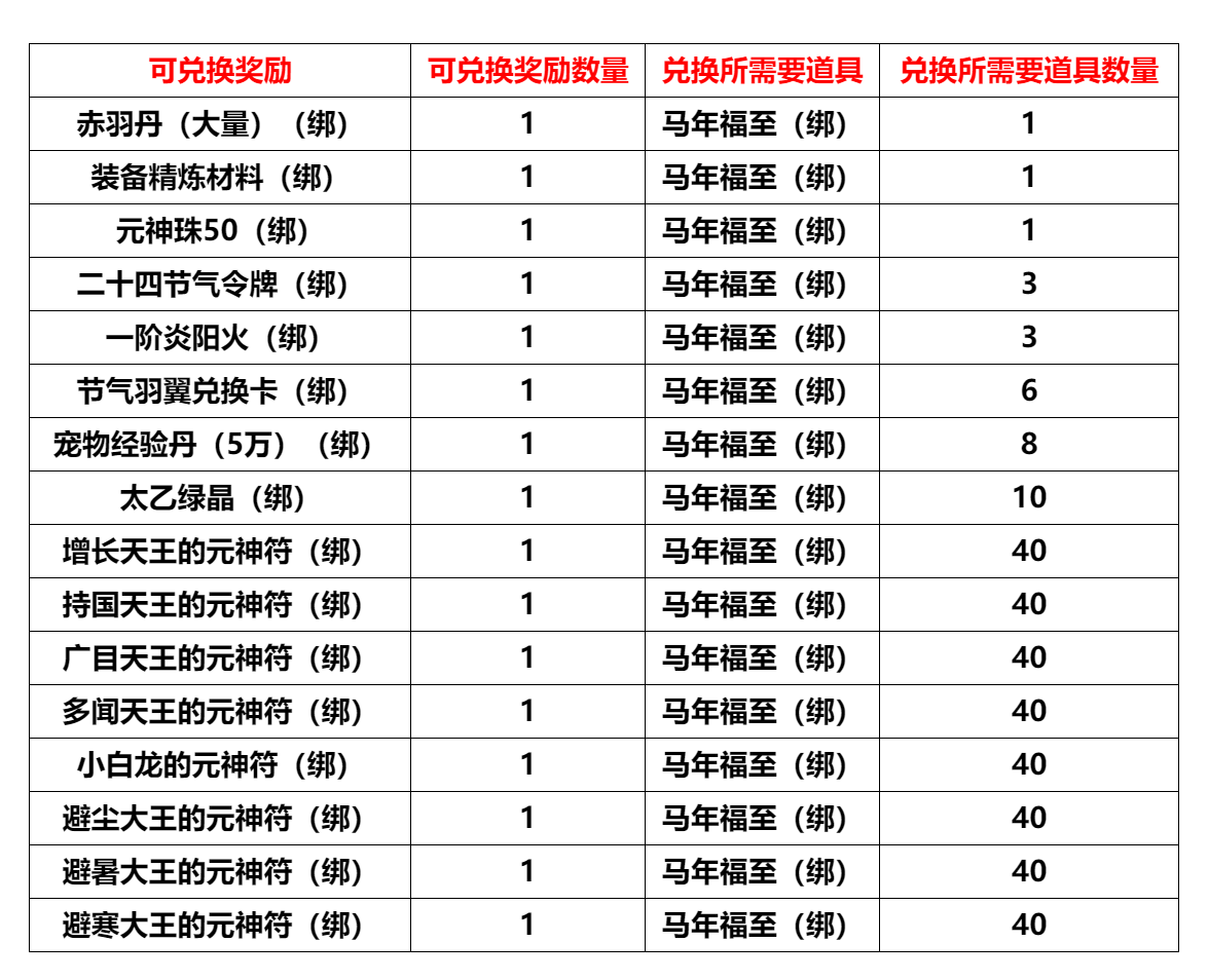 活动内容:上交30个道具【喜迎元旦(绑)】可兑换30个道具【马年福至(绑)】
