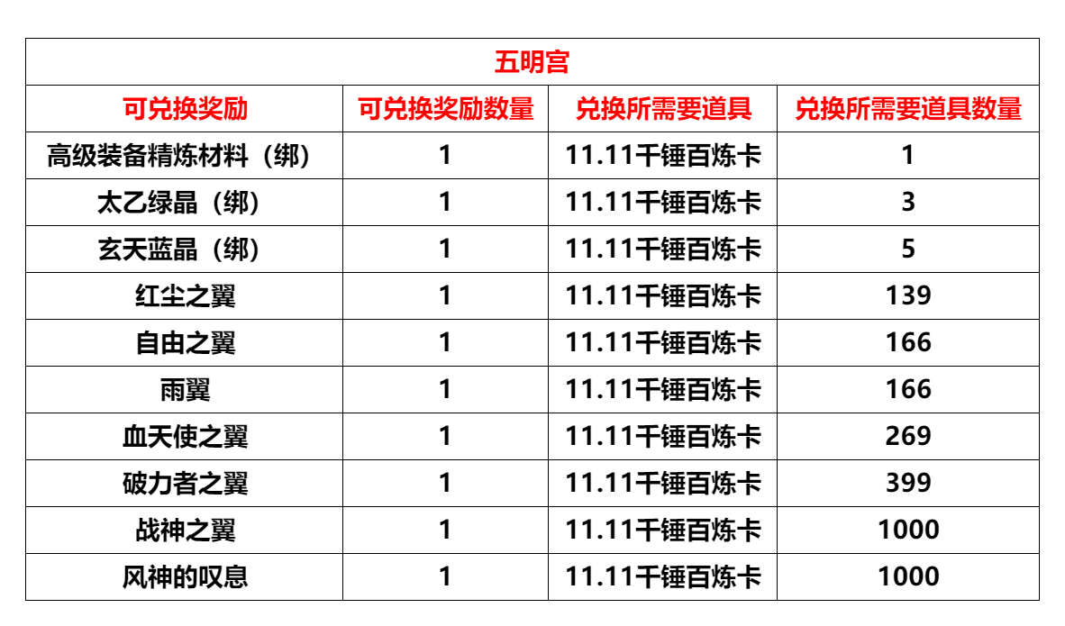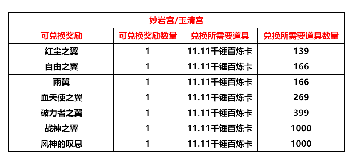 妙岩宫、玉清宫、五明宫:上架红尘之翼*1,兑换所需要道具139个;上架血天使之翼*1,兑换所需要道具269个