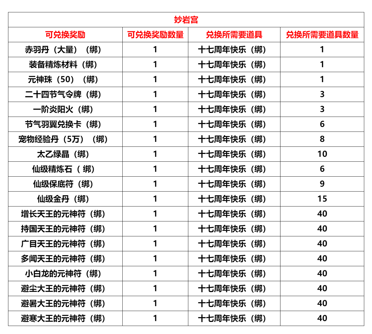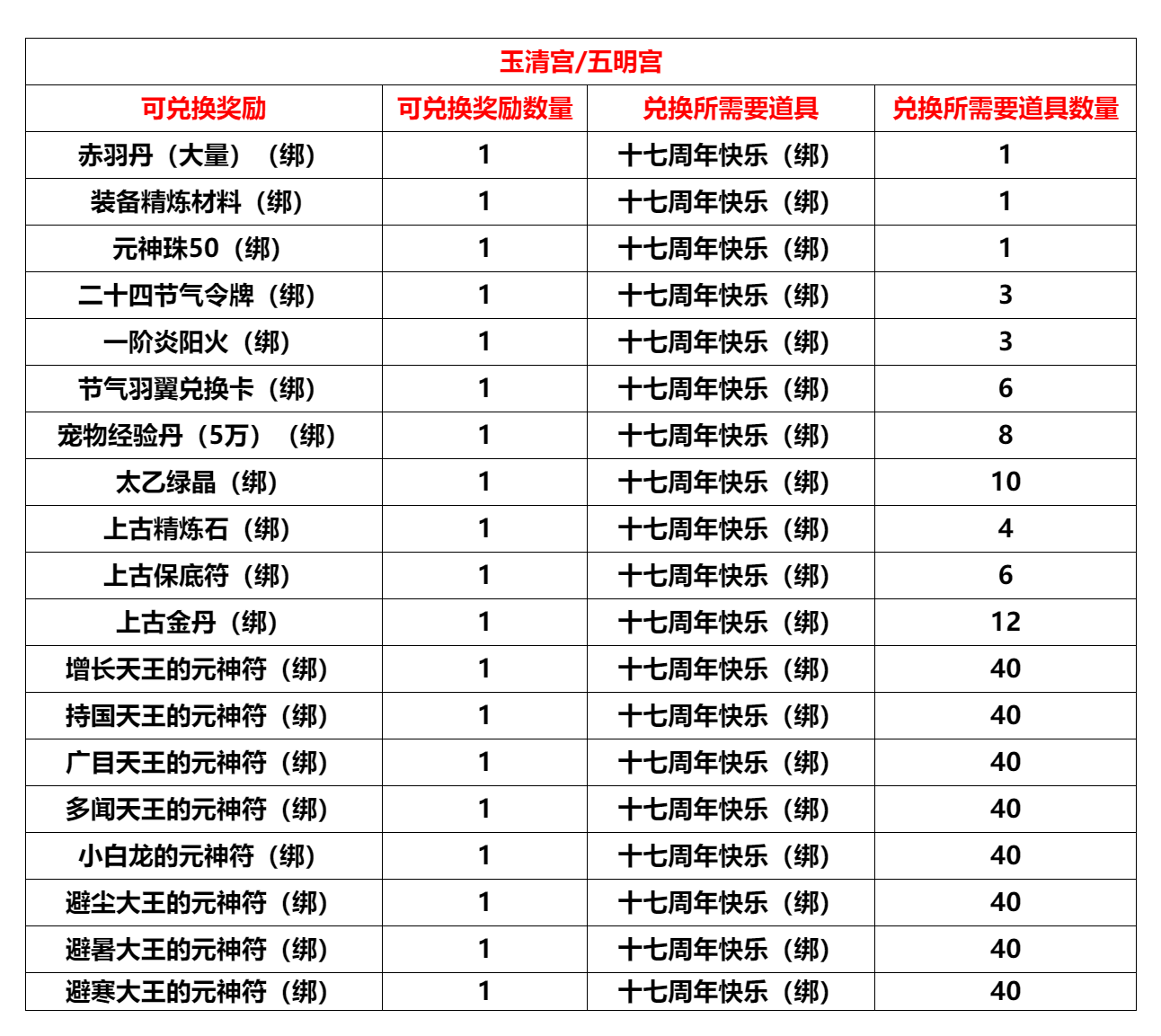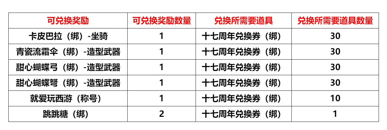 活动内容:上交30个道具【周年纪念章(绑)】可兑换30个道具【十七周年快乐(绑)】
