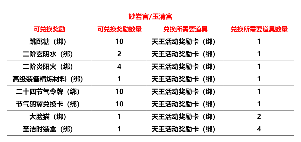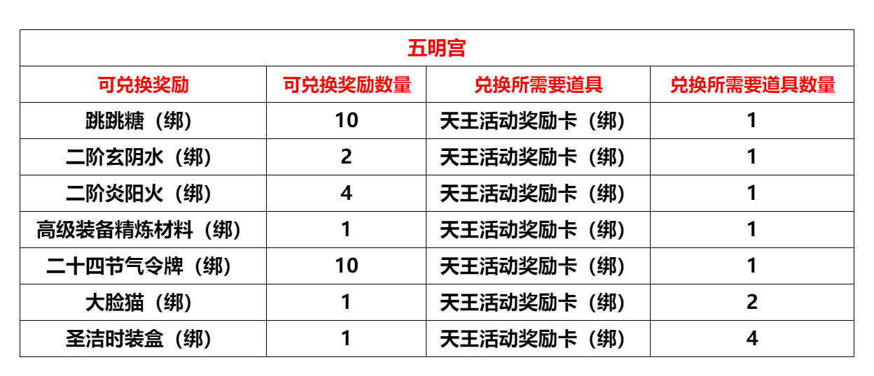 ※“天王活动奖励卡(绑)”可在长安广场NPC天王活动大使(长安广场:2517,740)兑换以下道具