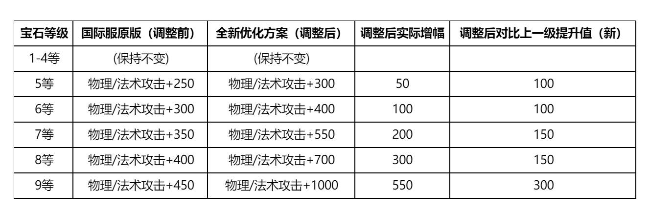 A: 我们理解您对游戏平衡的关心。这次“阶梯式”调整,正是为了让各阶段的成长更有层次感。 7级与8级宝石的提升幅度设为一致(均为+150点),这既能体现高级宝石的价值,也保证了成长是平稳可期的,避免了产生过大的数值鸿沟。而9级宝石作为顶级追求,其高回报是较大荣誉象征。 数值都经过严谨测试,我们会持续关注并优化游戏生态。以保障全体玩家的体验。