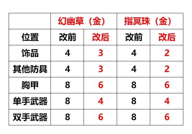 全面优化金装的制作图纸,下调金草与指冥珠数量。若使用图纸制作,一整套装备的“金草”消耗最高可节省20%!这意味着更少的投入,更快的成型!