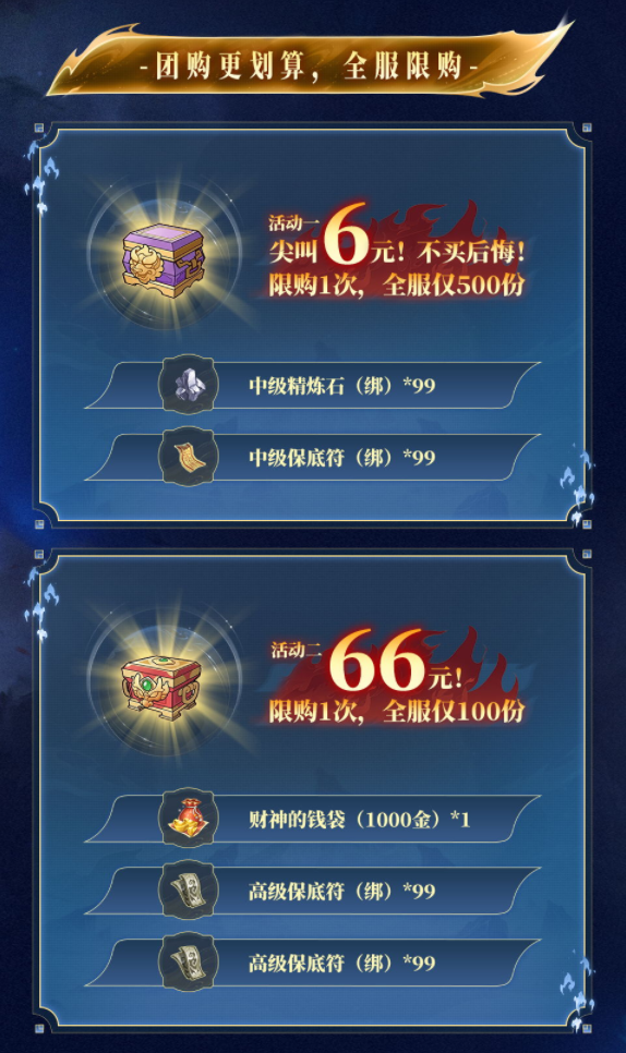 4、“特惠礼包”全服限购500个,“超值礼包”全服限购100个
