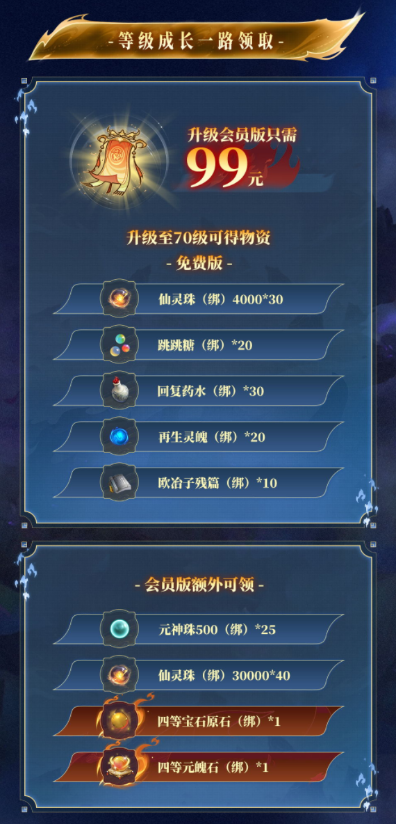 升级后,角色达到指定等级,即可在领取免费奖励的基础上,额外领取升级奖励