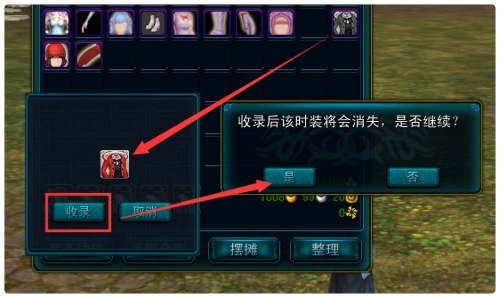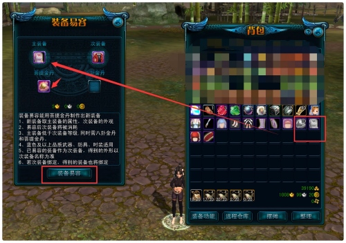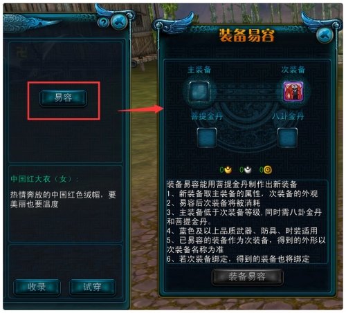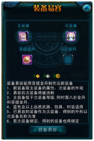 将需要易容外观的装备拖拽进去,消耗道具菩提金丹也拖拽进去